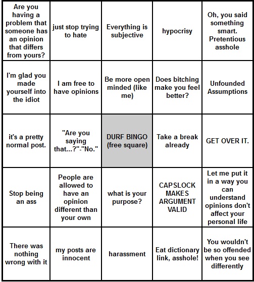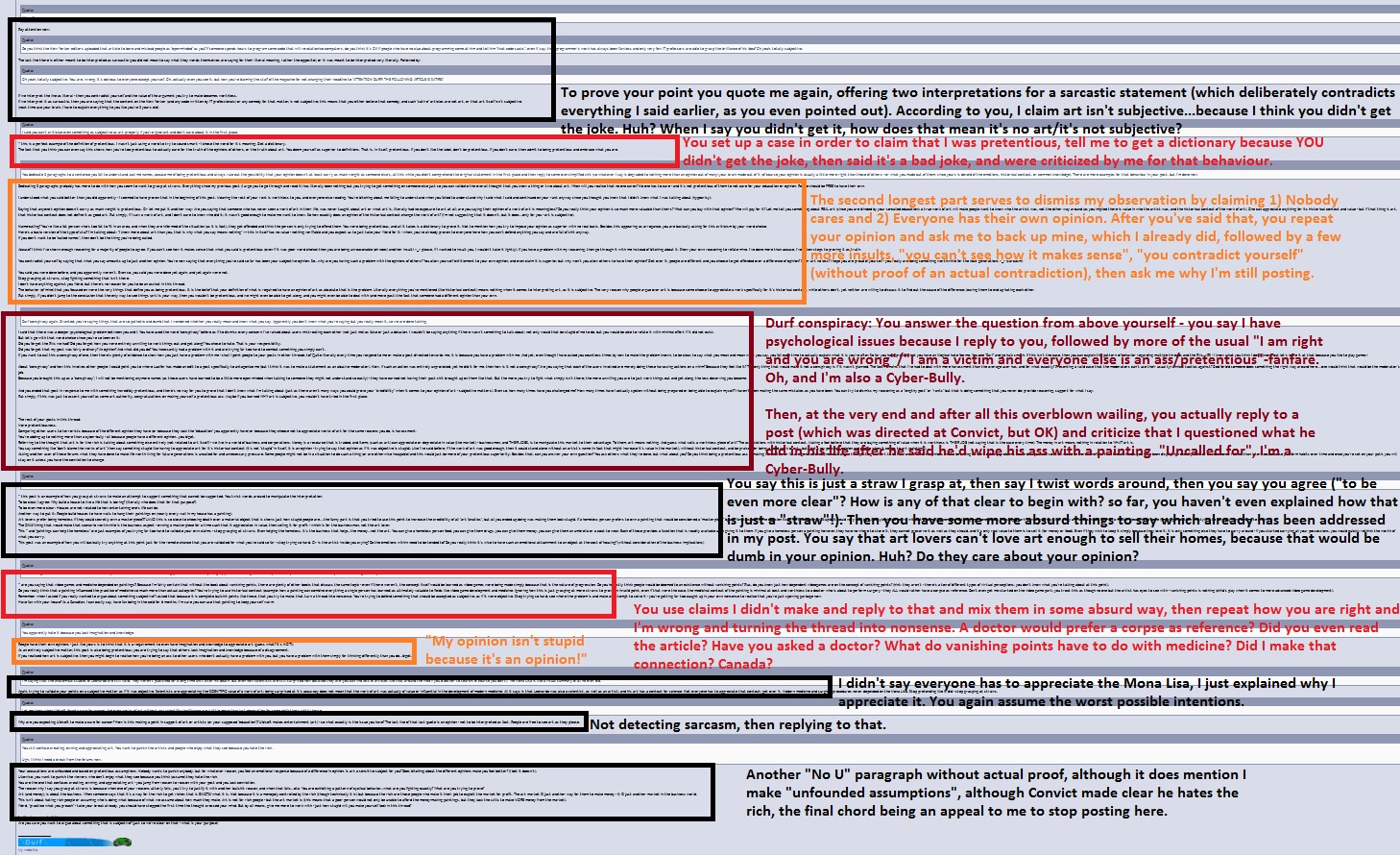Black = You criticize me for saying B when when I said A while providing no actual proof. Orange = Your opinion is infallible unlike anyone else's. Red = It seems like you actually reply to something that was said and think you provide proof, but don't. Dark Red = Durf conspiracy, first part completely nuts, second part forgivable because you lack emotional intelligence - but still wrong.