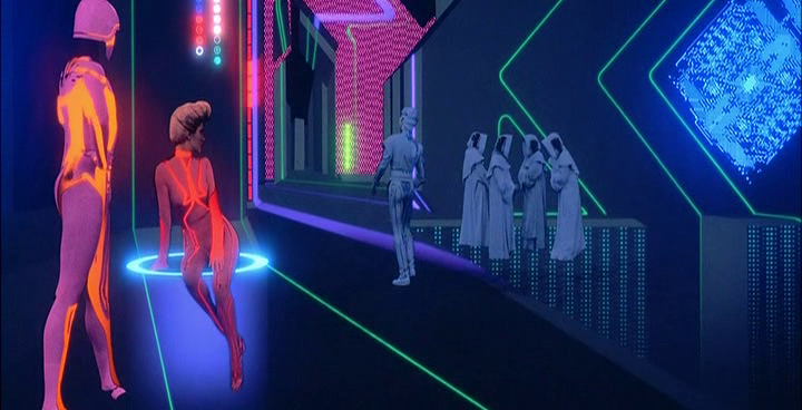 Today's movies emphasize dark realism. You see it in all the superhero movies. To me, Legacy feels deeply Film Noir. Is this scene a gritty part of New York on a rainy night or is it inside a computer? It's hard to know where you are in the movie since every shot looks the same. The color palette is remarkably narrow and everything is way too shinny. Legacy reminds me of how Photoshop filters were overused in the 90s (glow, drop-shadow, bevel/emboss). For some reason we are expected to believe this is the Tron universe just because everything glows.