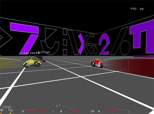 Another day, another lightcycle! I have made a game version of my high detail model of the lightcycle. This is a bigger file than the last one and is an acurate replica of the TRON movie cycle. I am still getting impresive FPS (<>50) from the latest version of the game running on my old faithful laptop. However I have realy done this one for all those lucky Dual Core users. I know someone getting 300 to 400 fps on a Dual Core Mac. So if you have the power you might like this model.