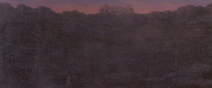 The grid wall should have battlements on it, I've decided. I think battlements against a black sky will probably go best to top the cliffs and mix with the banded sky. Rocky cliff. Man, the Cliffs of Insanity would be perfect if I could just get the mist out of the picture, leaving a nice clear cliff face. So grey stone. I'm thinking about building the cliffs in Blender.