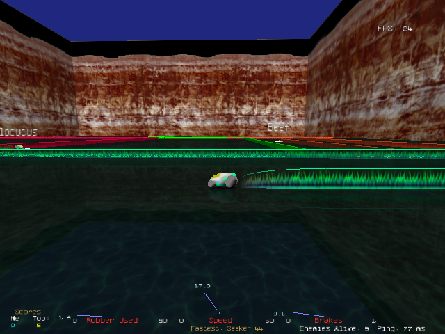 The wavy stuff on top of the wall is stuff that I turned to alpha, to see what effect alpha had on the grid wall. Tard says he can do a better water. This water's very close to what I was thinking. It's kind of a torquoise water with sun reflecting off it, and the movement of the cycle is enough to give the right impression to the water. Sorry mom, your water's good water for ocean water (needs waves for that, though). How about brightening it towards a really light blue? The one tard sent is kind of bluish-green, and I'd like to see something that's more blue and less green and see what it looks like. ;)