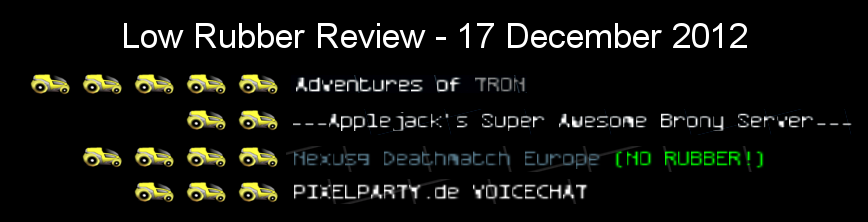 * COUGH *compguygene wrote:The hosting server that BiH, Shrunkland, and Tron Wars:Return of the Lightcycle is on is one of 2 hosting servers that I am dedicating to only Low Rubber.