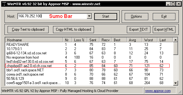 Below is a screenshot of my computer connected to RoadRunnerZ Sumo Bar. In this test, one of the routers between my computer and the server has an unexpectedly high average ping, higher than the ones further down the line. Of course there is nothing I can do about it. But it tells me the problem is not me or the server.