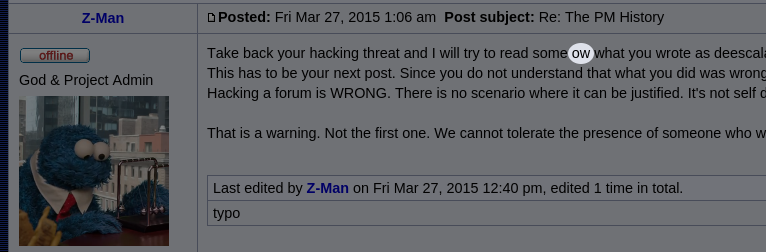 That is a warning. Not the first one. We cannot tolerate the presence of someone who would hack the forums. If you do not comply, I have no choice but to ban you.