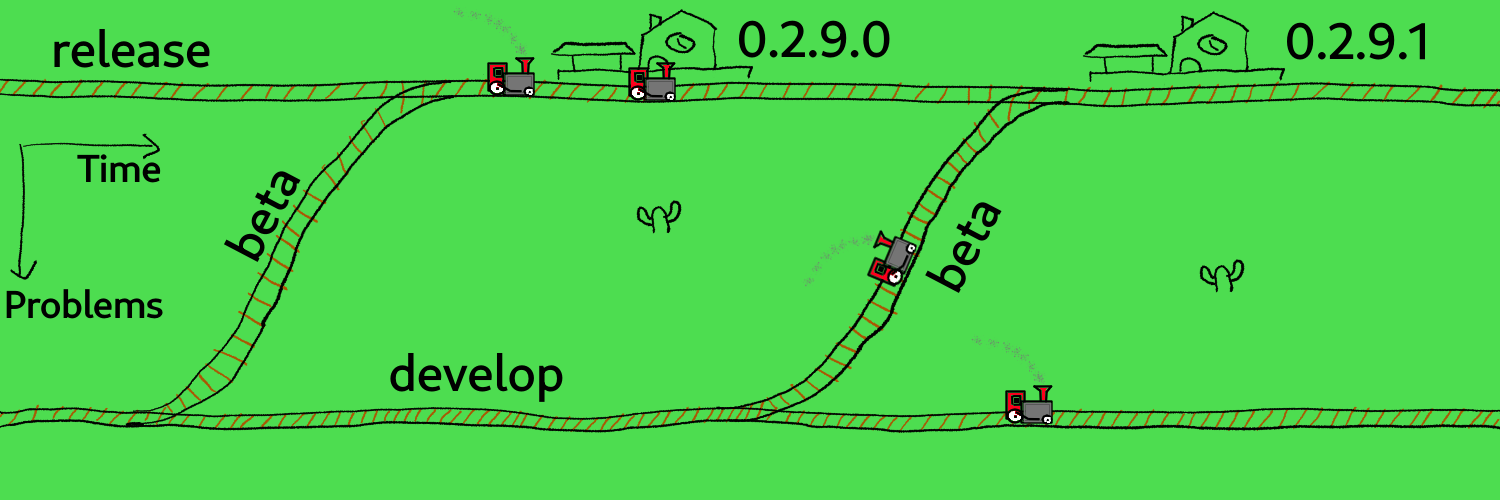 You can read the train tracks as a graph where time goes from left to right; the number of potential problems increases from top to bottom. Potential problems because while the development branch may not actually have more real problems than the release branch, it has more poorly tested changes.