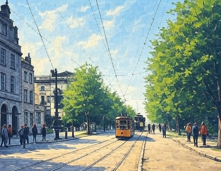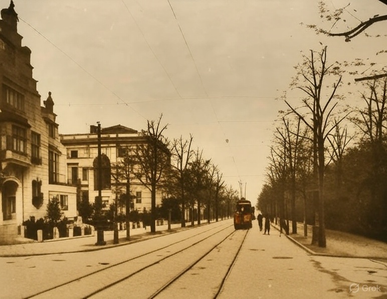 This image depicts a historical scene with a tram on a tree-lined street, flanked by ornate buildings. The architectural style and tram design suggest it’s from an early 20th-century European city. Based on the building designs, which resemble neo-Renaissance or neo-Baroque styles common in Germany, and the tram system, this is likely a street in Berlin, possibly Unter den Linden or a similar boulevard. This area was known for its grand architecture and tram lines in the early 1900s.