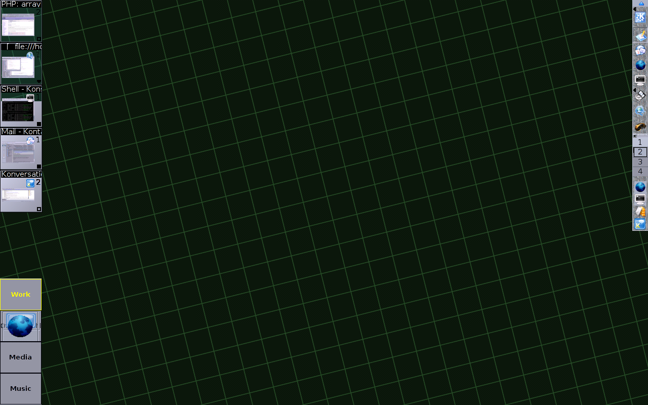 Currently experimenting with trying to get KDE to start with a hidden kicker and superkaramba, thinking about hacking up an interface that breaks free from the stupid desktop metaphor we've been using since I was a kid. (Or for some of you DOS people who always were a little slow, since I was a teenager) Yeah, so Plasma in KDE4 is supposed to roll kdesktop, kicker, and superkaramba all together, but I don't really want to wait. That's at least a couple of years away still, KDE4 is supposed to have a "technology demonstration" at the end of the year. Actual release is waaaaaay out.