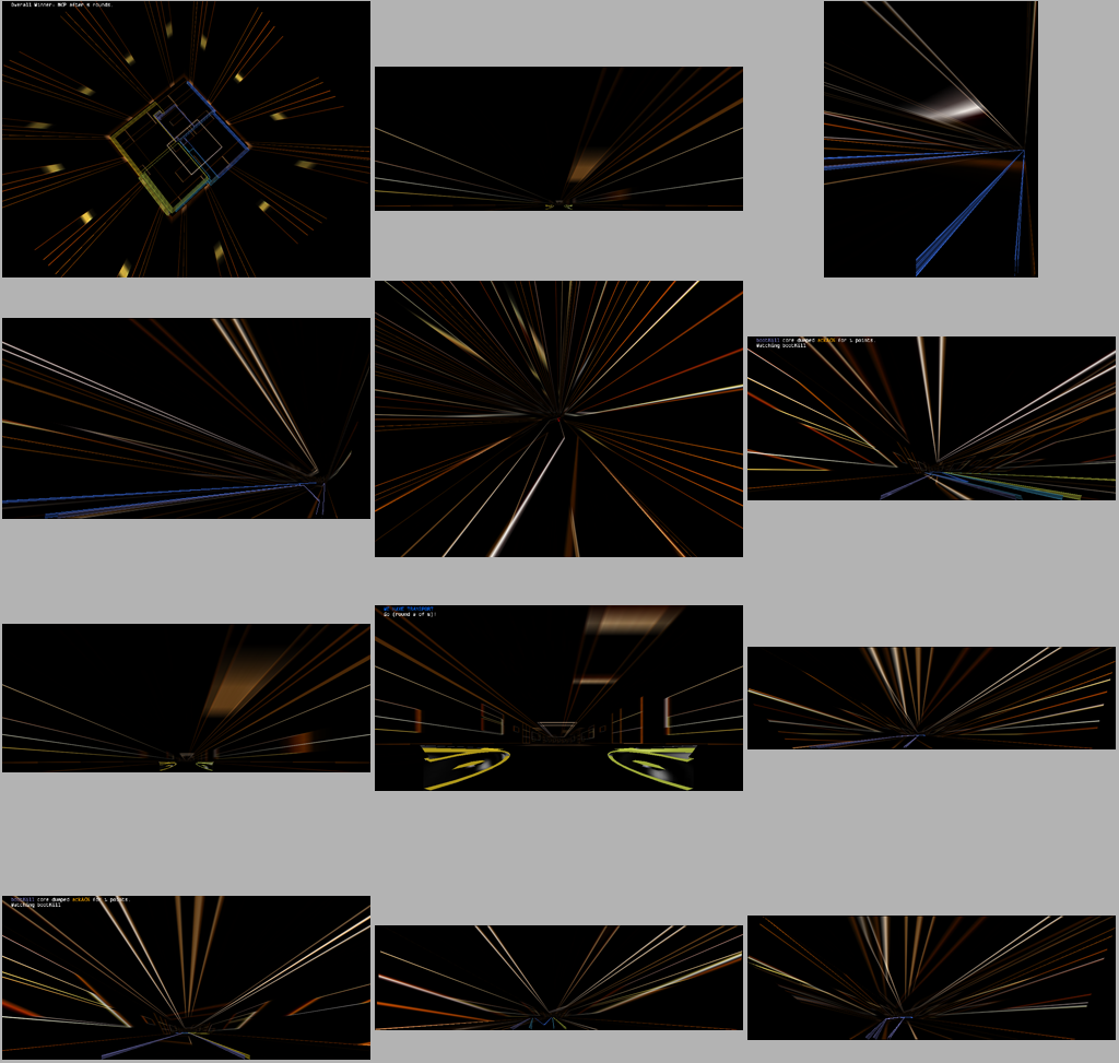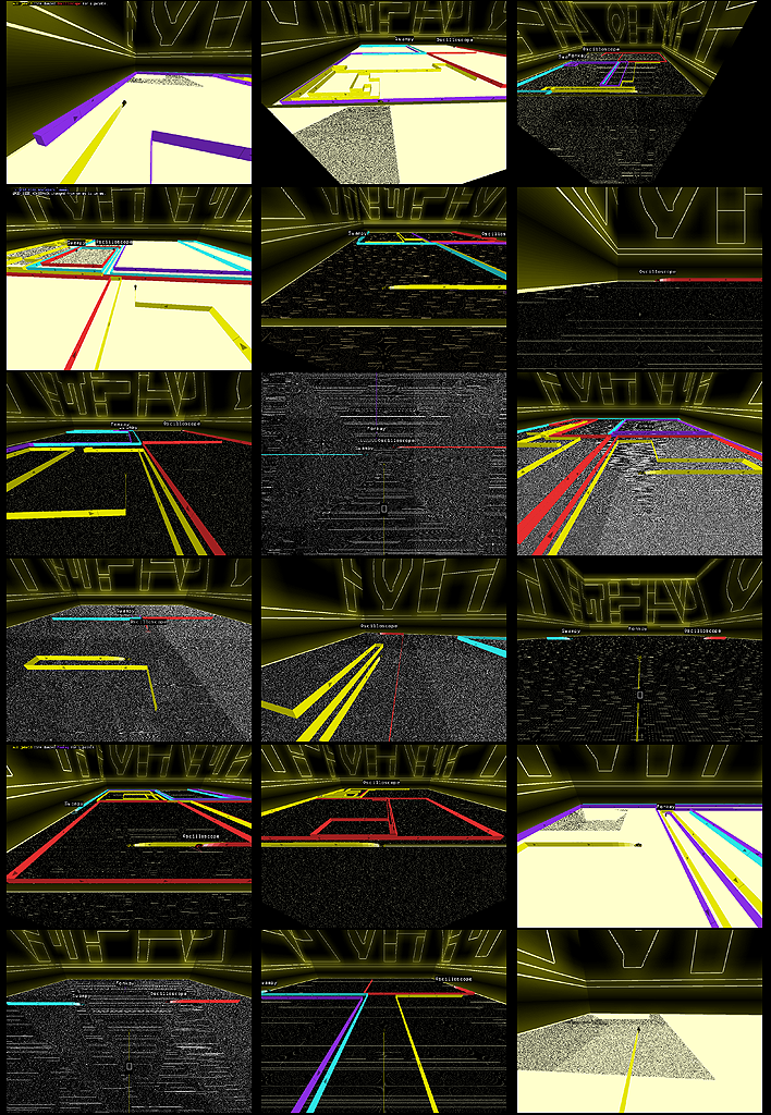 However, in this particular case, I probably should have mentioned that the noisy floor effect isn't created with a floor.png texture (although different textures can produce somewhat different noise and even moire characteristics). Rather, it's just the deal of setting GRID_SIZE[_MOVIEPACK] to silly low values, plus "nearest" detail. And if you hadn't deduced, the ones where there's flat color are where the floor is set to "just grid" (er, I think—this was, wow, actually about a year ago that I took those). I thought it odd how it got all polygonal.