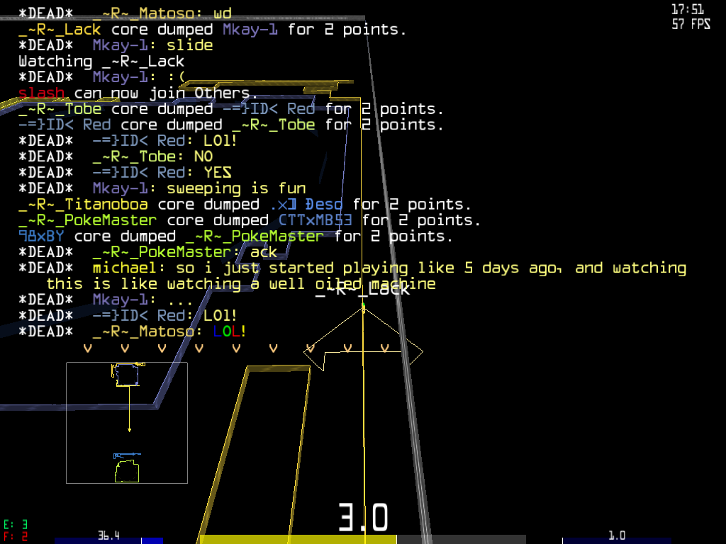 Anyway, I liked this: And there was this. Keep in mind, this was shortly after I returned to the game last year and I was using a generic alias; nothing recognisable. (The [Phytotron] was added when editing, and of course I wasn't using that on the forum a year ago, anyway.) As far as this guy was concerned, I was just some random player. Player's screenname removed "to protect the innocent," and superfluous console messages chopped to save space. Unfortunately, this way you don't get the suspense of the time elapsed between his messages, but just imagine them. And finally, this from Shrunkland. Those who've played there are more likely to get the absurdist humour here, but really, anyone should. Excepting, perhaps, the goofy high (>5) rubber crowd. "I crashed by hitting a wall? How could that be?"