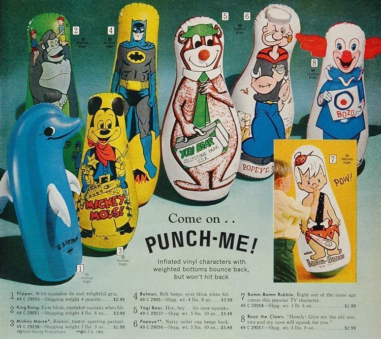 Heh, here ya go. Note Bozo the Clown. I didn't have any of these specifically, but I did have a kid-size inflatable punching bag, and I think I recall it had some kind of clown on it, but maybe not.Oh man, the springs on those suckers! You'd get going (gotta love the squeaking sound) and invariably fall off and get a bit of your skin caught between the expanded springs. Pain! Or you'd get a piece of clothing caught in one and pull the whole thing over on top of you. You'll notice all the modern ones now have coverings over the springs, heh. But for decades, pain!