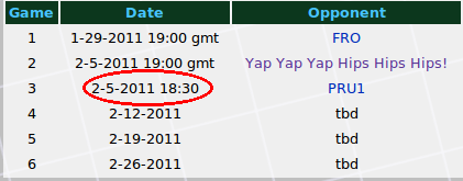 I have a suggestion Concord. When you make the schedule, can you please place later games after earlier ones? When I looked at our (Unknown) schedule, I though for sure 18:30GMT was a typo and should have been 19:30GMT. I guess I was the only one who thought that, and I have no idea if there was even a match played (doesn't look PRU showed up, so I guess it doesn't matter).