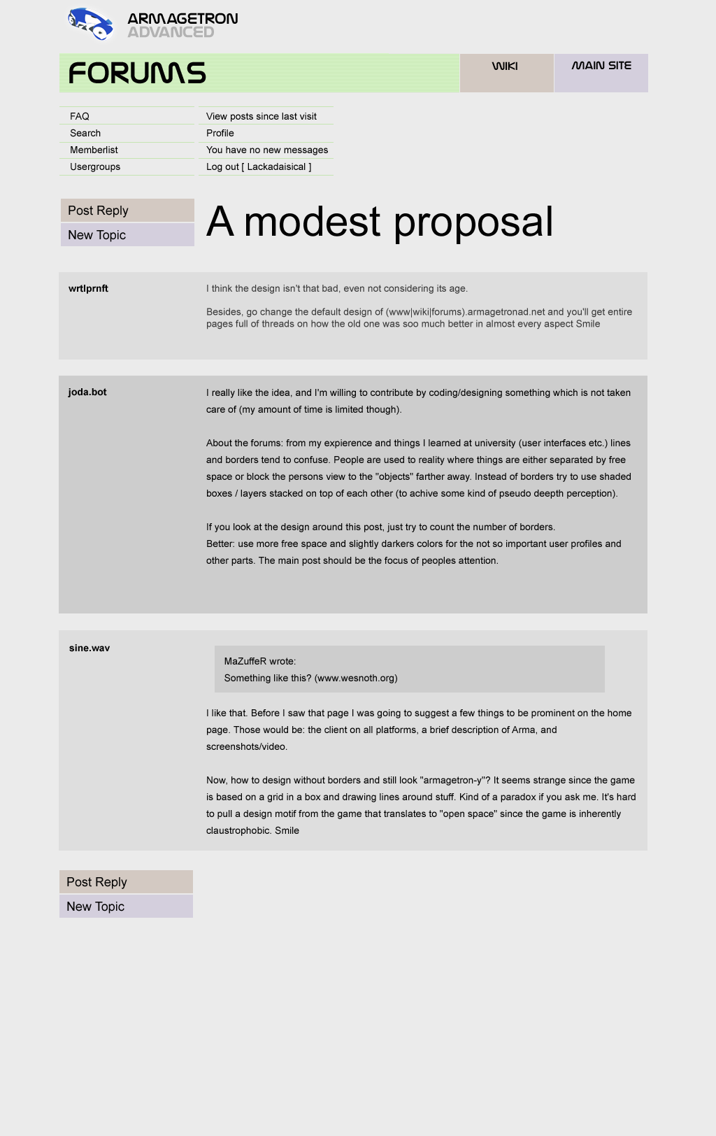 Where would quote/edit/ip/delete buttons go? I use those quite frequently. Ranks and post counts would be good to see too. Same for avatars and location. I don't personally use the buttons under the posts that often, but maybe a link to the profile would be good to maintain. The "Armagetron Forums Index -> Armagetron -> General -> A Modest Proposal... " links would be good to retain.