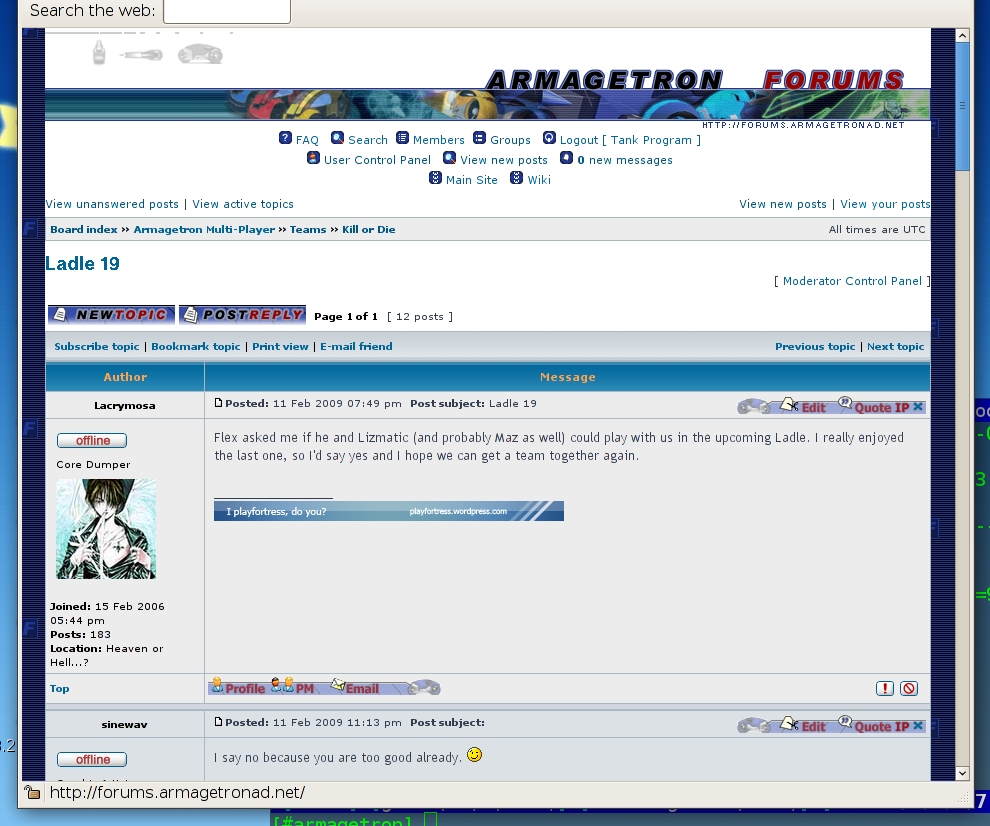 Tank Program wrote:Where would quote/edit/ip/delete buttons go? I use those quite frequently. Ranks and post counts would be good to see too. Same for avatars and location. I don't personally use the buttons under the posts that often, but maybe a link to the profile would be good to maintain. The "Armagetron Forums Index -> Armagetron -> General -> A Modest Proposal... " links would be good to retain.
