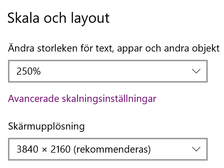 (Apologies for the Swedish. It says Scale & layout; Change the size for text, apps and other objects; Screen resolution; (recommended).)