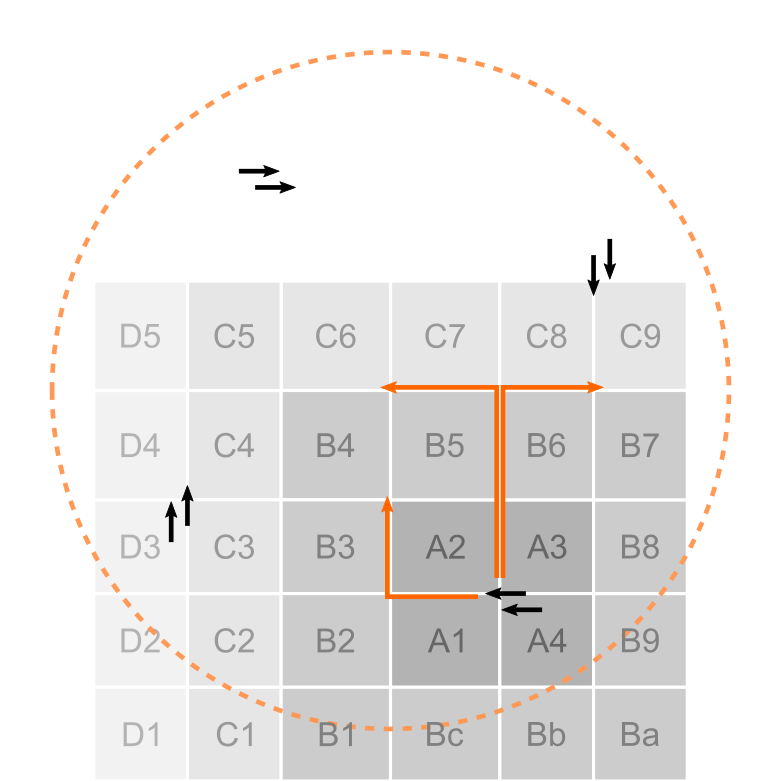 What I want to know is if it makes more sense for Position 2 to take the opposite side of Position 1 and occupy more space in proximity to each other rather than leaving to reach the other side? For example, Pos 1 takes A2, B5, B4, B3, and Pos 2 takes A3, B8, B9, A4...)